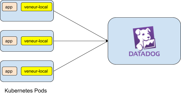 In this example, veneur-emit is a stand-in for any application you want to observe, if it’s instrumented using statsd client libraries. Since it’s the main application – and first container – in our pod, we’ll begin with the vanilla setup: