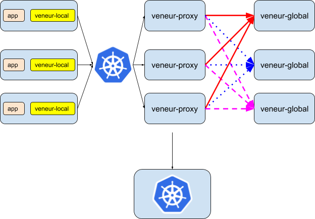 Fortunately, this is all handled automatically by the veneur-proxy and veneur-global services. The veneur-proxy pods distribute the metrics consistently – all red metrics (the solid red arrow) end up on the same global pod, all blue metrics (blue dotted arrow) end up on the same global pod, and all pink metrics (dashed pink arrow) end up on the same global pod.